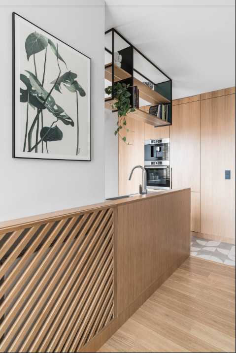 ▲因?yàn)槿~石 十分注重空間的美觀性,所以一些可能有礙的物件,全被定制的木料包圍,營(yíng)造出視覺上潔凈、統(tǒng)一的感受。