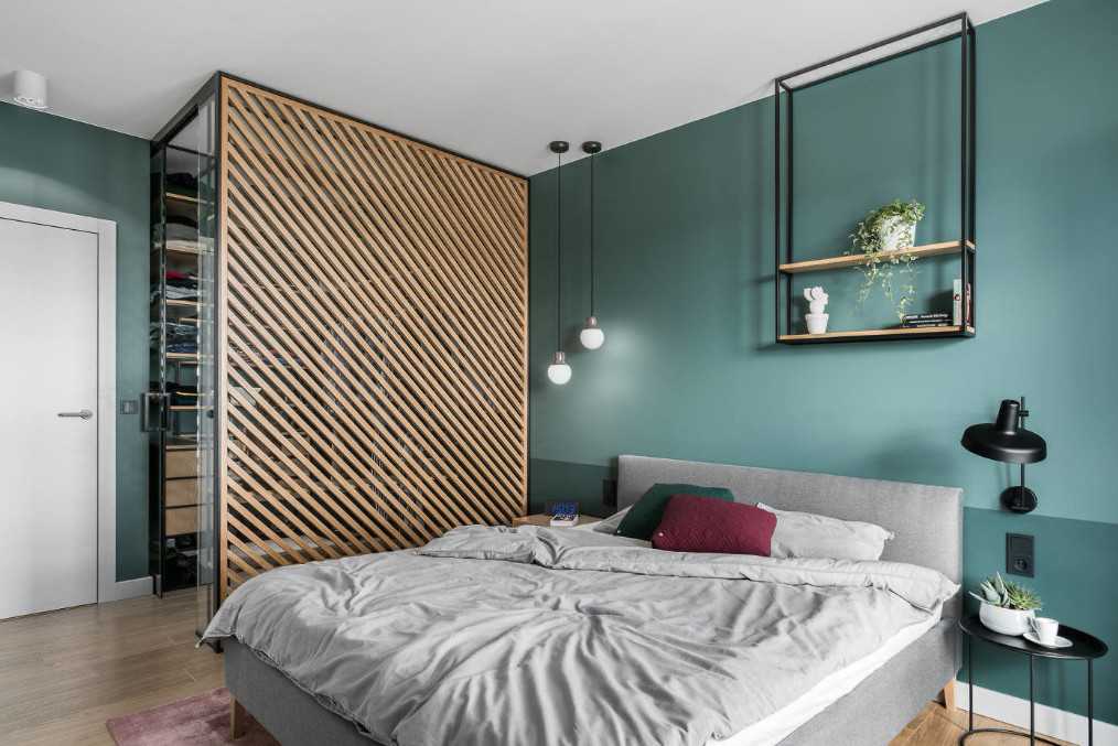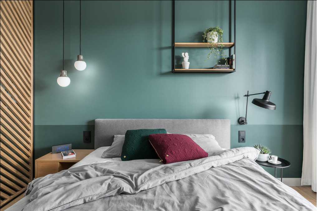 ▲以綠色為貫穿室內(nèi)的線索,卻通過色彩的深淺營(yíng)造出豐富的視覺效果,僅是臥室,綠色就被分為了四層,首層是鮮活的盆栽,二、三層是墻面的漸變,四層是抱枕。