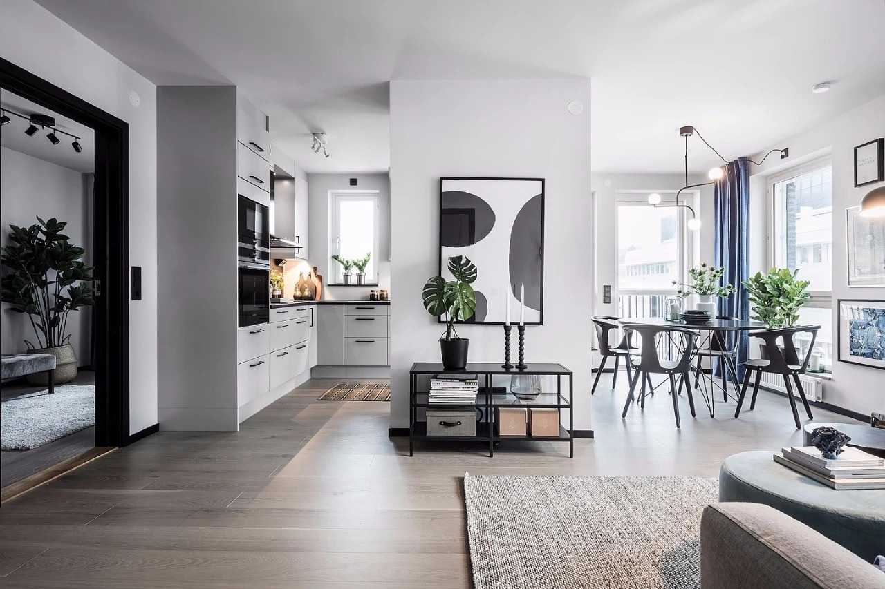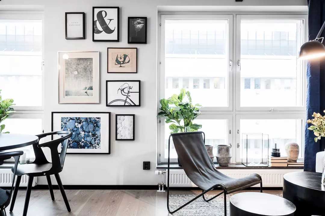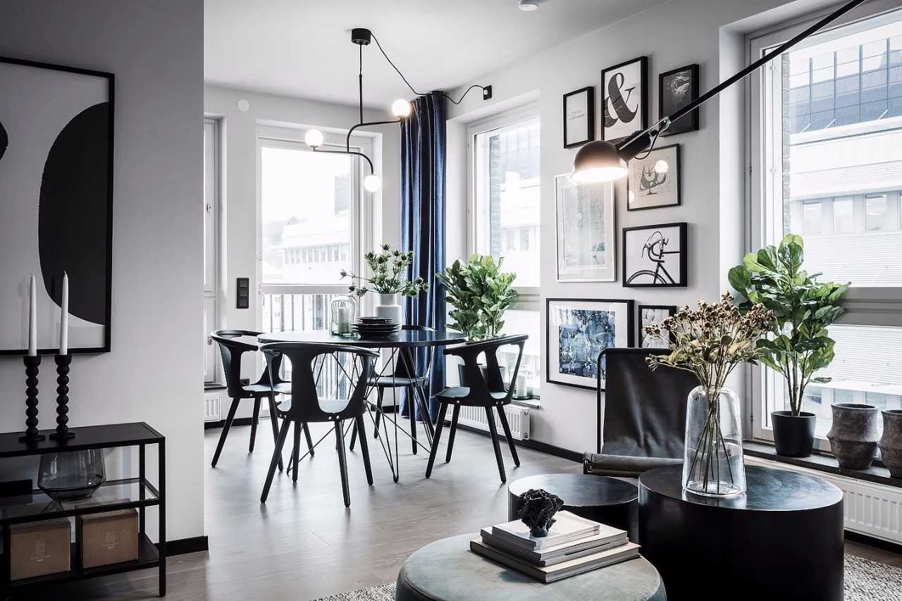藍(lán)色配飾面向黑色細(xì)節(jié)與海報(bào)的拼貼畫混合了跳蚤小說天花板燈,黑色餐桌,椅子在之間和傳統(tǒng)通過結(jié)合開放式解決方案中的顏色,房間被認(rèn)為更大且連貫。