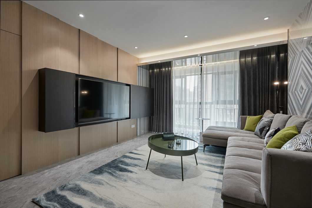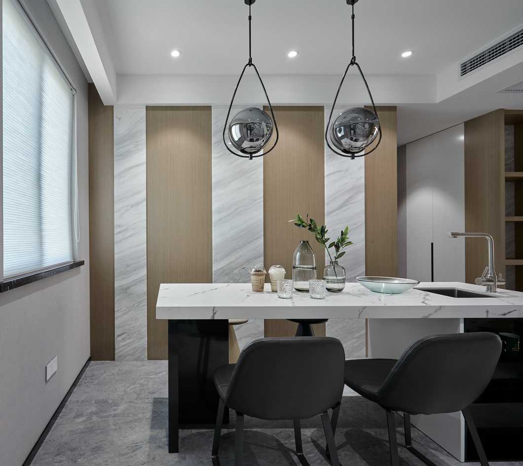客餐廳縱向線條拉伸感極強(qiáng),不同材質(zhì)相互碰撞,以及恰當(dāng)?shù)墓庥皩^(qū)域空間揉為一個(gè)整體。電視背景墻高低錯(cuò)落,并且把電視柜“抬”到了墻上,保留儲物功能的同時(shí)帶入了當(dāng)代設(shè)計(jì)流行元素。凝練簡約現(xiàn)代的生活質(zhì)感,光影襯出選材的自然肌理,在木頭的溫潤與石材的剛硬凌冽交織一起,勾勒出獨(dú)特的空間氣質(zhì)。