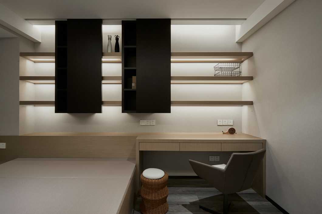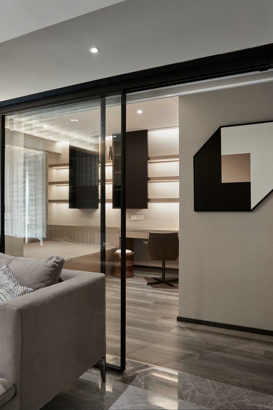 書房于客廳僅一扇移門為界,通透的玻璃讓兩個(gè)空間保持獨(dú)立的同時(shí)增加了許多互動(dòng)感,釋放了空間的可能性