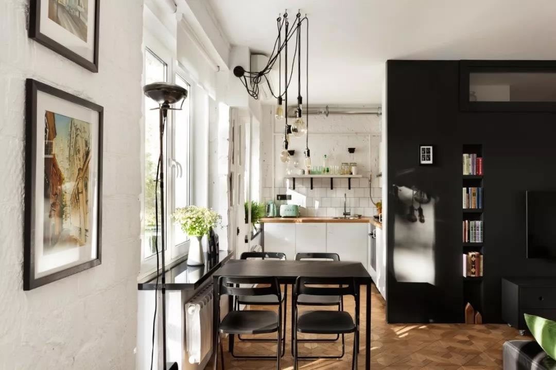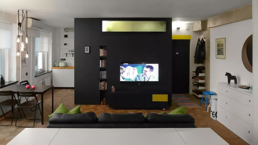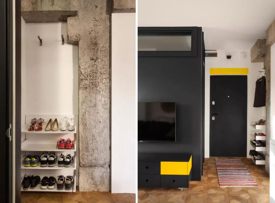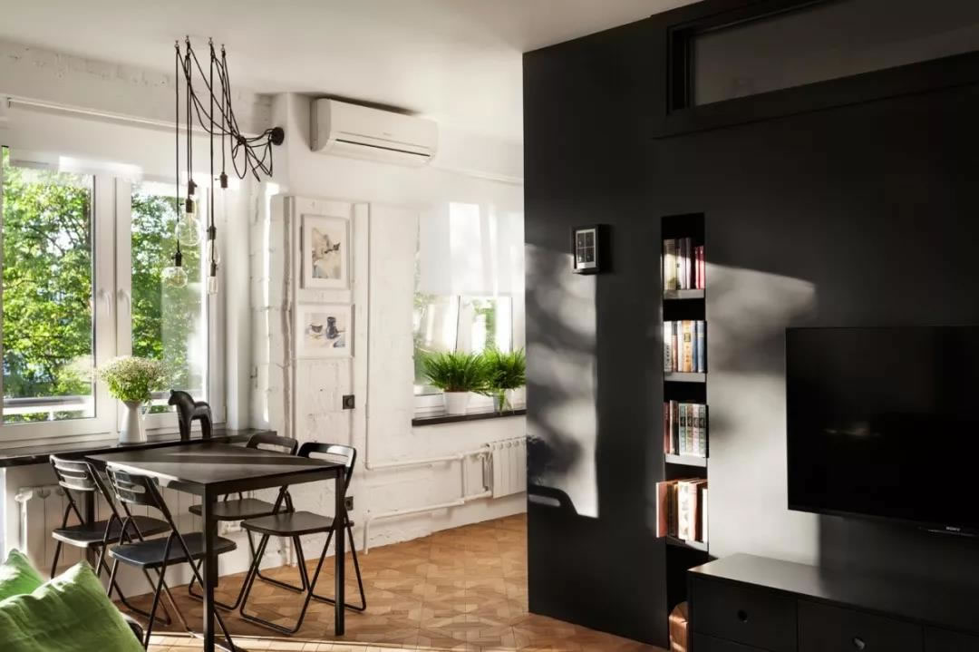 非常大膽的時(shí)尚公寓設(shè)計(jì),這套僅有43平方米的房子,給人留下深刻印象。以啞光黑色結(jié)構(gòu)為中心,在外面裝有娛樂系統(tǒng),然后它的內(nèi)部竟然隱藏了一個(gè)浴室??