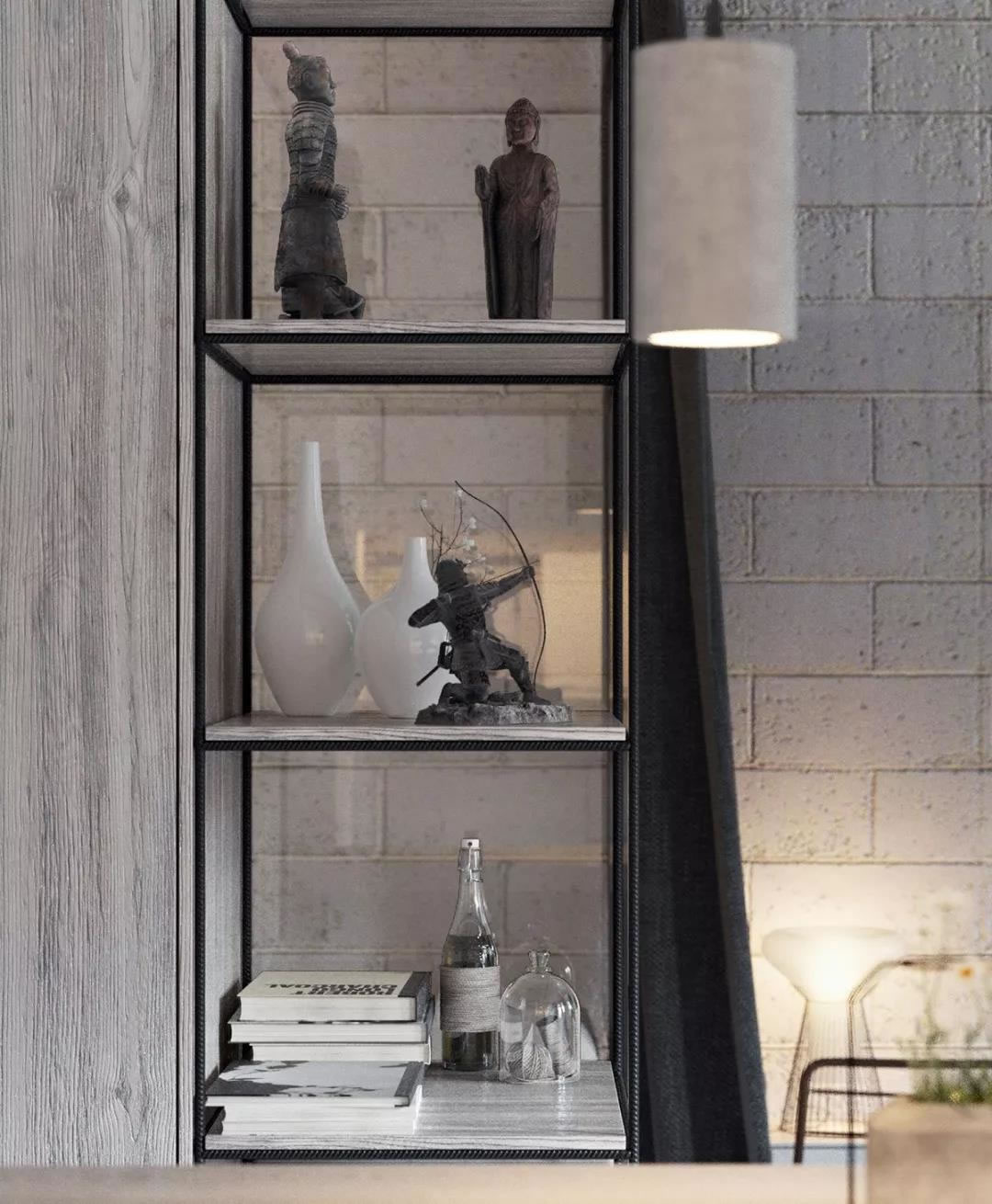 精心策劃的細(xì)節(jié)讓這間小公寓更加溫暖,我們可以看見書籍們都隱藏在電視背景墻里,很讓人意外。