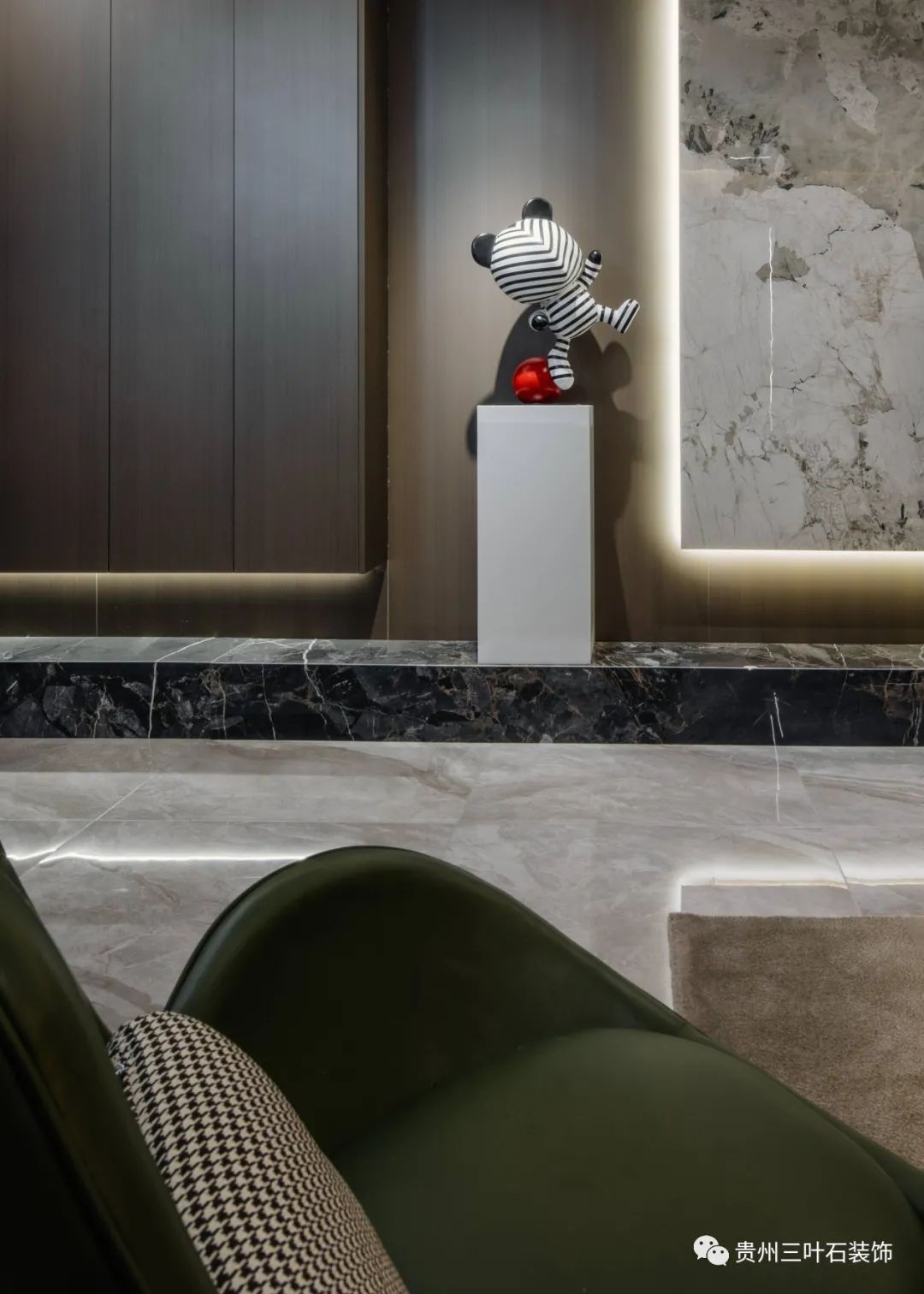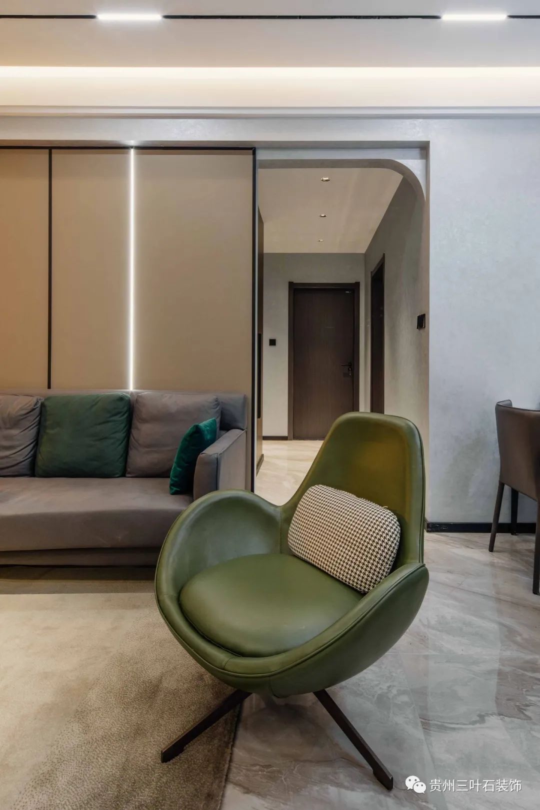 采取無(wú)主燈設(shè)計(jì),吊頂做磁吸軌道燈,黑色極窄軌道簡(jiǎn)潔,增加空間流動(dòng)感,同時(shí)在吊頂中暗藏?zé)魩ё鳛殚g接照明。主燈由三盞簡(jiǎn)燈代替,防眩暈簡(jiǎn)燈,光線柔和減少常規(guī)簡(jiǎn)燈射燈刺眼的問(wèn)題,盡可能節(jié)省層高空間營(yíng)造出寬敞開闊的視覺感受。用純熟的線條技巧讓空間顯得利落輕盈,不同的墻面材質(zhì)豐富視角感官。搭配墨綠色的皮藝單人椅搭配灰色系毛絨地毯,奠定空間整體的沉穩(wěn)高級(jí)基調(diào)。