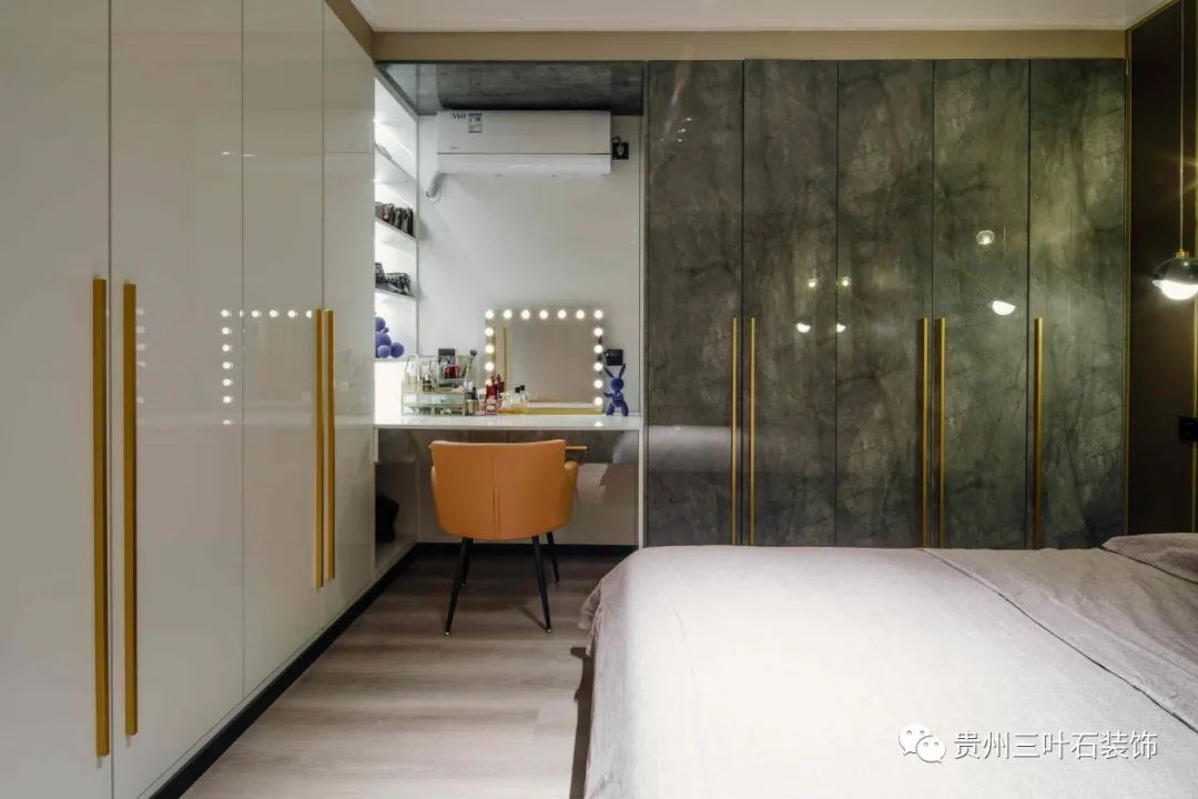 深棕色調(diào)木飾面與細(xì)膩的背景墻石材疊加,生成強(qiáng)烈的空間層次。同時(shí)在下面增設(shè)收納地臺(tái),兼顧儲(chǔ)物功能。吊頂里隱藏的無(wú)主燈燈光順著墻面灑下來(lái),光影與木質(zhì)、石材交錯(cuò)共生,沉浸式的氛圍感撲面而來(lái)。給整體空間增加了層次感與立體感,在現(xiàn)代簡(jiǎn)約主義空間中流露出寫意之美,素淡而簡(jiǎn)雅。